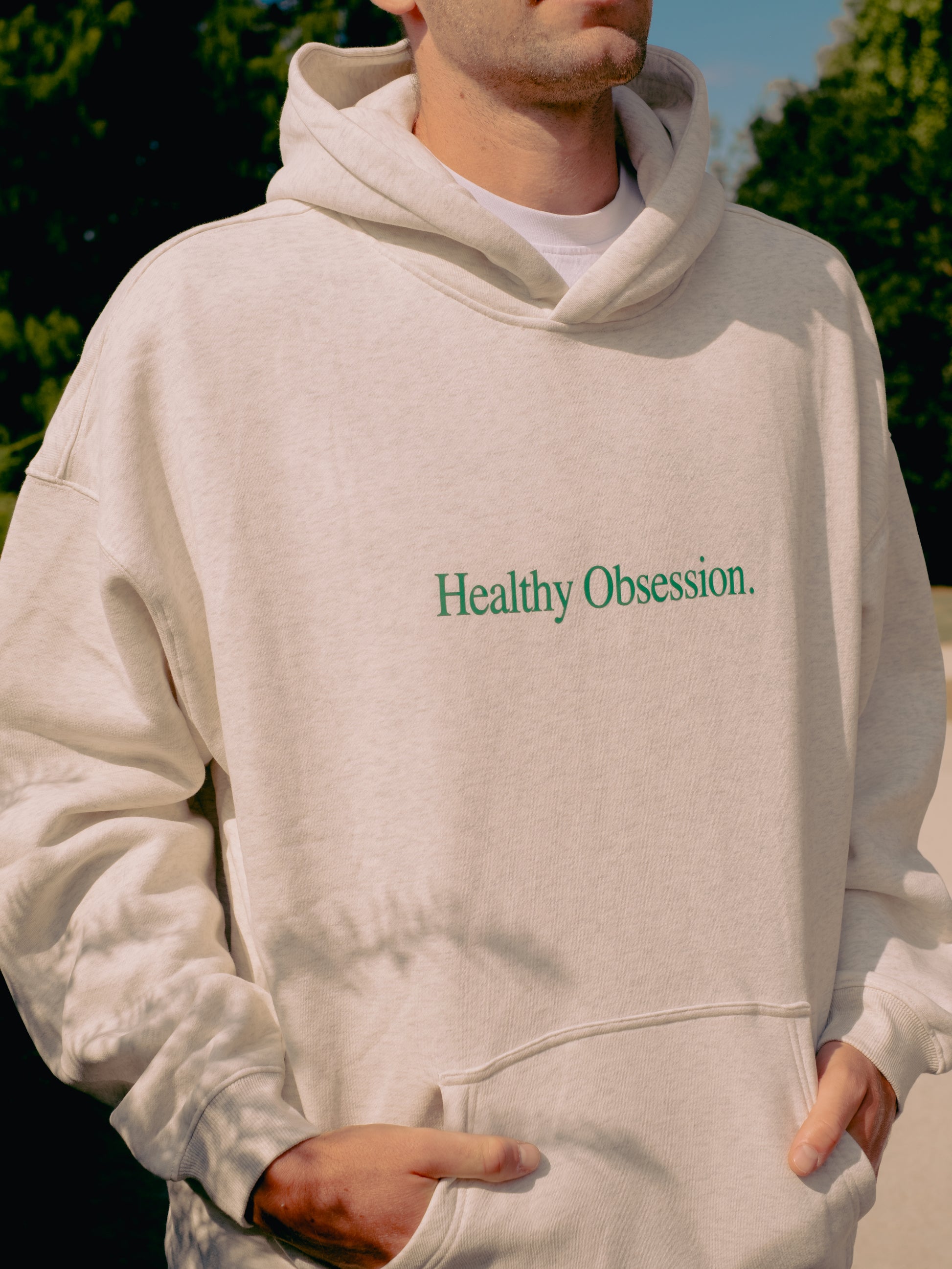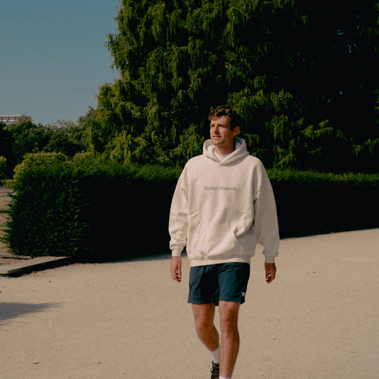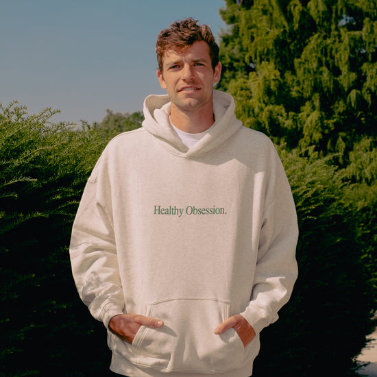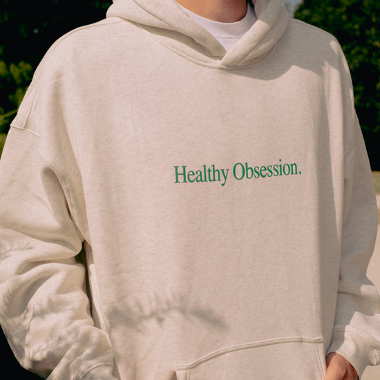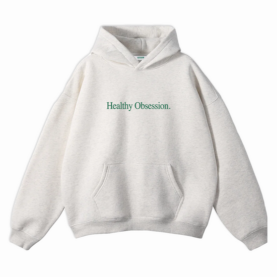 Our Healthy Obsession hoodie in light grey marl is made from 100% fleeceback cotton, with screen printed text on the front and has a boxy, unisex fit. For a more oversized fit we recommend that you size up.