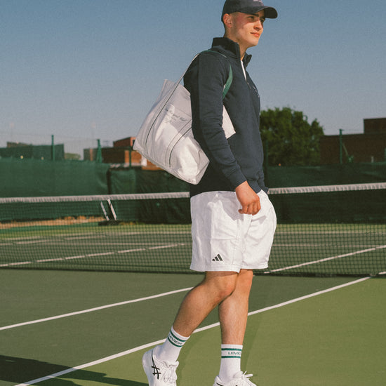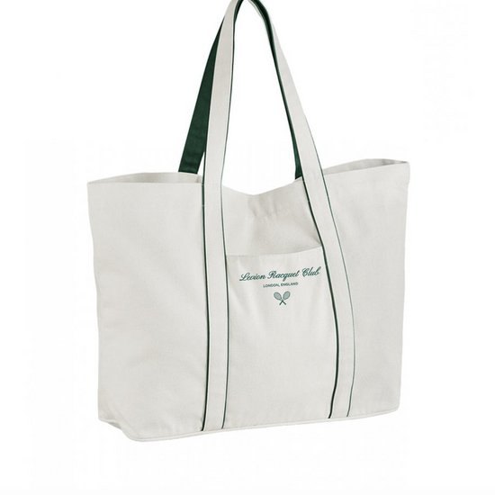Our Racquet Club tote bag is crafted from recycled cotton, this everyday tote features a magnetic main closure, hidden external slip pocket, and contrast-detailed handles. Finished with a bold printed logo on the front.